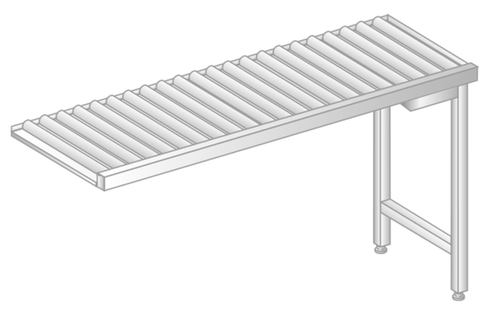 Stół wyładowczy rolkowy do zmywarek wykonany jest ze stali nierdzewnej, o spawanej konstrukcji zapewniającej sztywność i wytrzymałość na równomiernie rozłożone obciążenia pionowe (do 2000 N) i boczne (do 1000 N). Stół wyposażony jest w wyprofilowaną powierzchnię roboczą z 10 mm zagłębieniem zabezpieczającym przed spływaniem wody poza obrys stołu oraz ochronny kołek uziemiający umożliwiający przyłączenie przewodu wyrównującego gromadzące się ładunki elektryczne na powierzchniach roboczych.