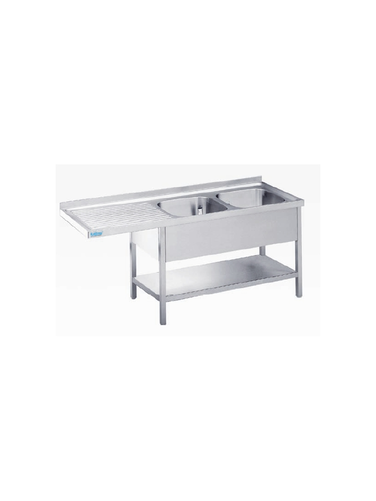 • Stół ze zlewem 2-komorowym, półką i wydłużonym ociekaczem (600 mm) wykonany ze stali chromowo-niklowej 18/10 AISI 304