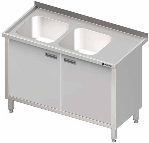 Stół ze zlewem dwukomorowym z lewej strony z drzwiami skrzydłowymi 1100x700x850 mm | STALGAST, 980887110