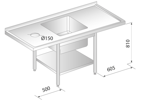 Stół ze zlewem, półką, otworem na odpadki i miejscem na zmywarkę wykonany ze stali nierdzewnej, o spawanej konstrukcji zapewniającej sztywność i wytrzymałość na równomiernie rozłożone obciążenia pionowe (do 2000 N) i boczne (do 1000 N) wyposażony w wyprofilowaną powierzchnię roboczą z 10 mm zagłębieniem zabezpieczającym przed spływaniem wody poza obrys stołu, zaokrąglone krawędzie wewnętrzne komory zlewu, co zapobiega gromadzeniu się zanieczyszczeń oraz ułatwia utrzymanie jej w czystości, wyprofilowane dno komory zapewniające całkowite odprowadzenie wody oraz ochronny kołek uziemiający umożliwiający przyłączenie przewodu wyrównującego gromadzące się ładunki elektryczne na powierzchniach roboczych.